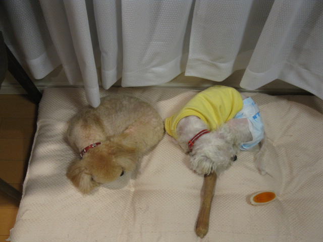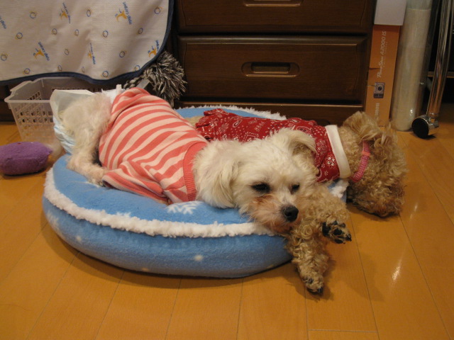 何故か疲れておっさんのような寝姿で爆睡中。